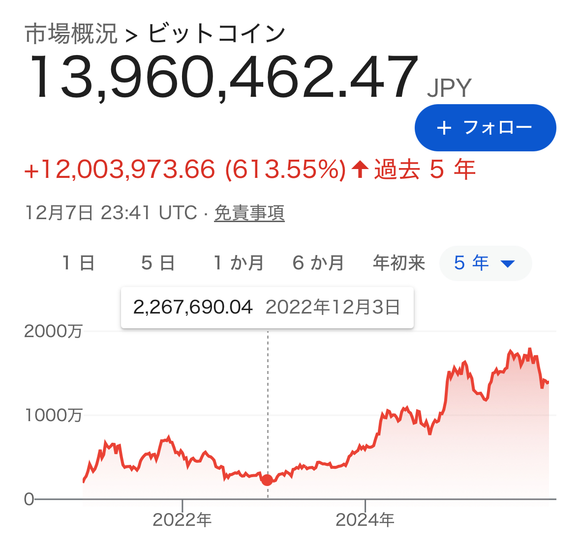 3年前のビットコインレートが226万円、2025年のビットコインレートが1396万円
