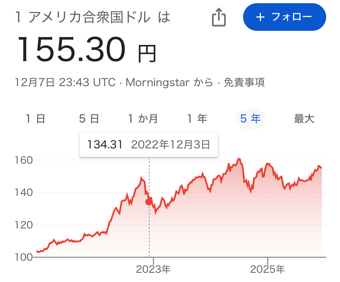 3年前のドル円レートが134円、2025年のドル円レートが155円